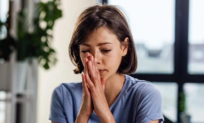 Ellerini başına koymuş oturan genç bir kadın | Kaynak: Midjourney