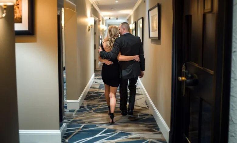 Bir otel koridorunda yürüyen bir adam ve bir kadın | Kaynak: Midjourney