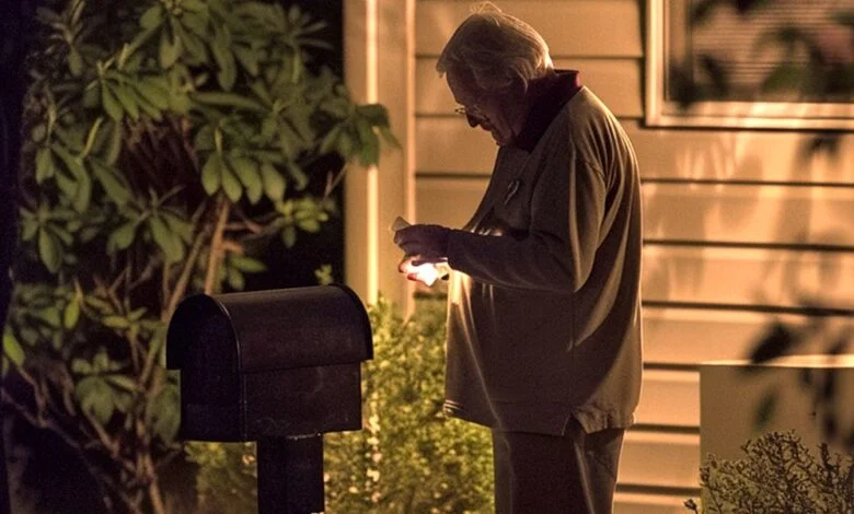 Bir evin önünde posta kutusunu açan yaşlı bir adamın gece çekilmiş fotoğrafı | Kaynak: Midjourney